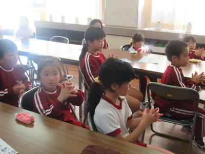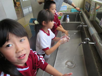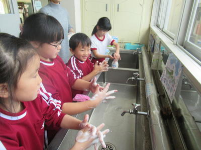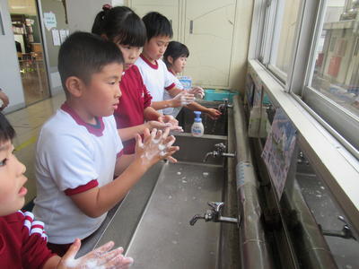 感染予防のために、ビオレ あわあわ手洗いの歌の「おねがい、おねがい、かめさん、かめさん~~」の歌に合わせて、洗い残しのない手洗いのしかたを練習しました。