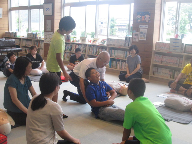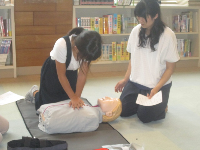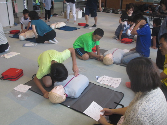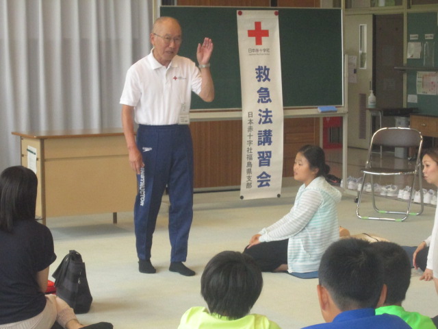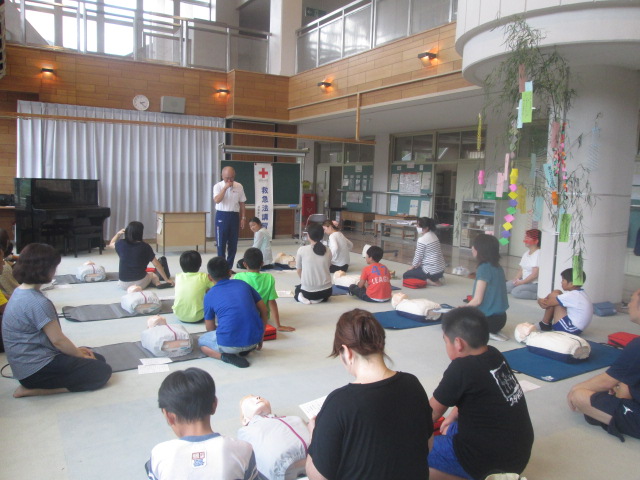 救急法講習では、今年も日本赤十字社より赤十字救急法指導員の大浪先生においでいただき、心肺蘇生法やAEDの使い方等を丁寧に教えていただきました。昨年度より、4年生以上の子どもたちも受講しており、子どもたちも熱心に取り組むことができました。夏休みのプール開放に備えての講習でしたが、水の事故等のないよう、十分に気をつけていきたいと思います。