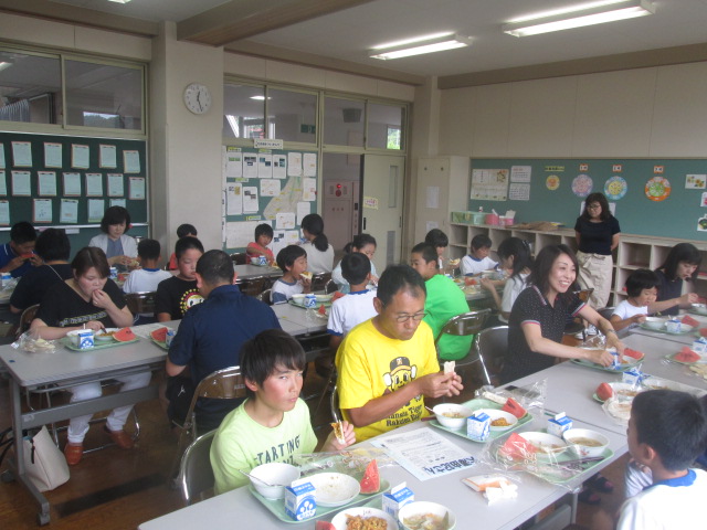 授業参観に先駆けて、保護者の給食試食会が行われ、おうちの方と楽しく給食を食べました。南部給食センターの渡辺先生においでいただき、箸の持ち方や栄養についてお話をしていただきました。
