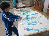 雨の月曜日ですが、1・2年生が図工室で楽しそうに作品を作っていました。一人1枚の大きな模造紙いっぱいにダイナミックな絵を描いていました。何が出来上がったのでしょう。