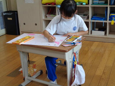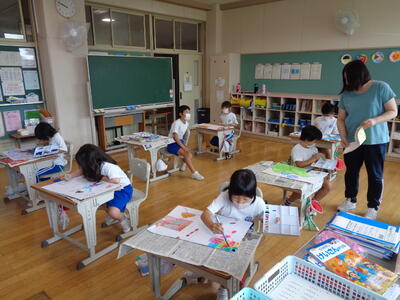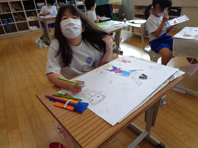 1・2年生は図工の時間でした。1年生「おはなしからうまれたよ」、2年生「たのしかったよ ドキドキしたよ」