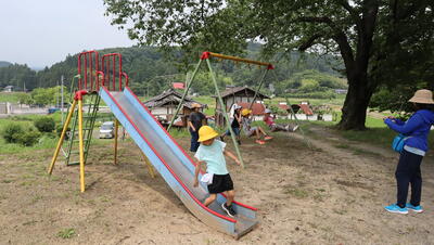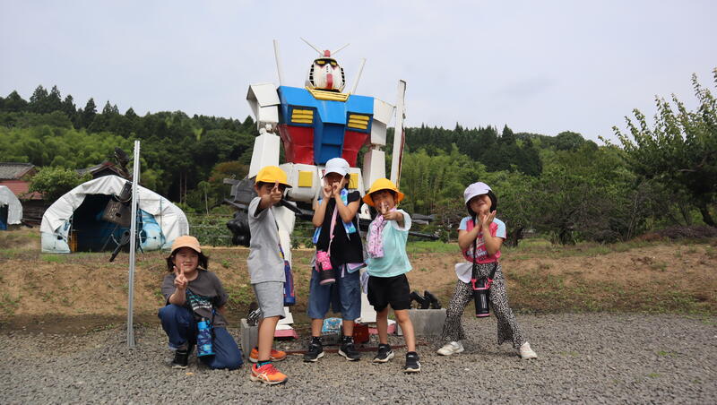 ガンダムと記念写真をとって平石神社で遊具を楽しみました!元気だね!流石!平石っ子!