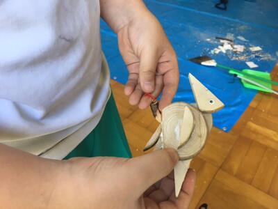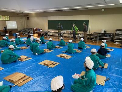 秋晴れの気持ちい良い日になりました。5年生はバスに乗って二本松市のフォレストパークあだたらにて、もりの案内人さんにお世話になって森林環境学習を進めています。午前中は木工クラフトづくりをして、外でお弁当です。