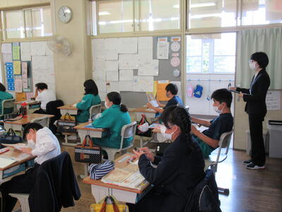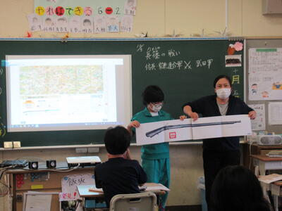 6年生の社会科の授業では、織田信長が長篠の戦いで用いた「火縄銃」の重さ(約4kg)を担いでみたり、実際の長さを図で確認したりしながら、戦の様子に思いを馳せて戦国時代への課題意識を高めました。また、昨日から3年生の学級で教育実習をスタートさせた関口先生も授業参観をし、歴史を感じるひと時となりました。
