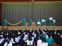 28日の全校集会では、図書委員会が全校生に読書のすすめを呼びかけました。本を借りた人には素敵なしおりのプレゼントをするそうです。