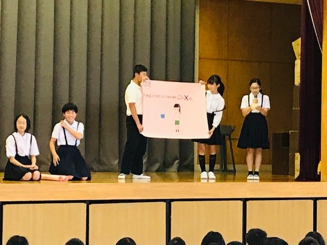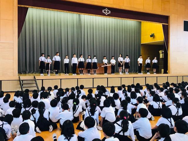 6月24日の全校集会で、保健委員会の児童が全校生に熱中症とはなにか、どんなことに気をつけると良いかなどの「熱中症○×クイズ」を行いました。