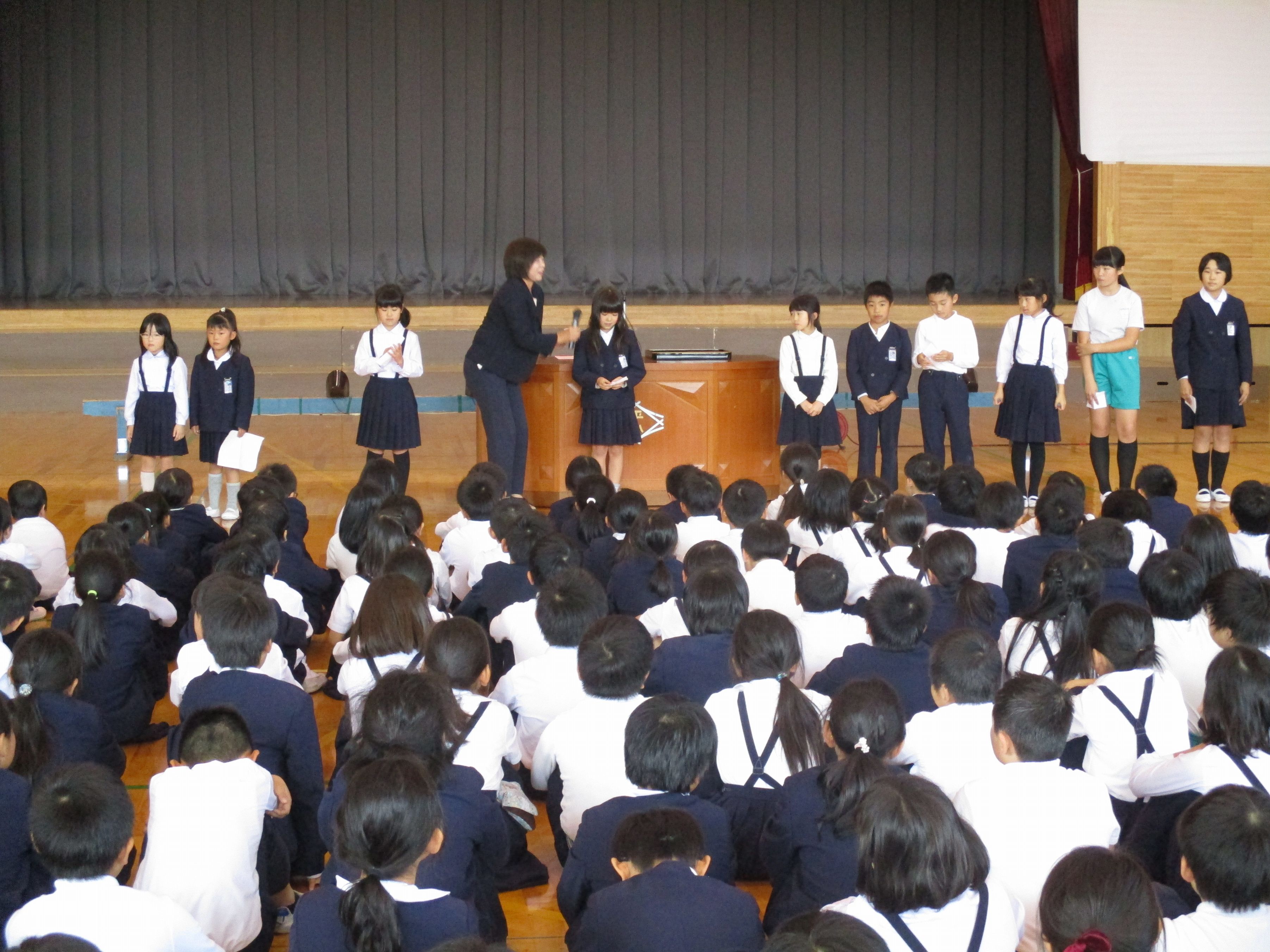 10月16日(火)全校集会が開かれ、今週末に行われる学習発表会の、各学年の見所を発表しました。