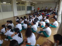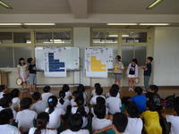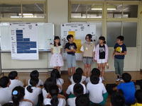 大変短い時間でしたが、福島特産のきゅうりや凍み豆腐が入った給食を一緒に食べて、お互いの学校を紹介しあったりしました。尾久小さんが「好きなゲームや好きなテレビ番組、好きな遊び」等、両方の学校の5年生でアンケート調査を行った結果を発表すると会場は大盛り上がりでした。5年生の好きなものに、あまり地域差はなかったようです。