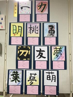 平野小のみんなは、色紙に好きな漢字を一字書いて展示しました。