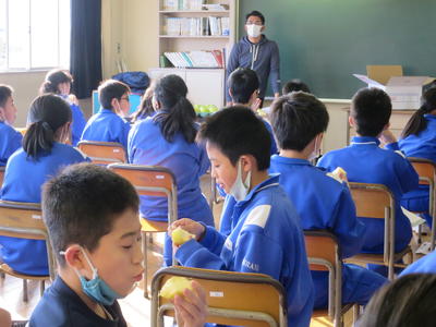 青いリンゴや黄色いリンゴを実際に持参していただき、生徒たちがそれらの食べ比べをしました。