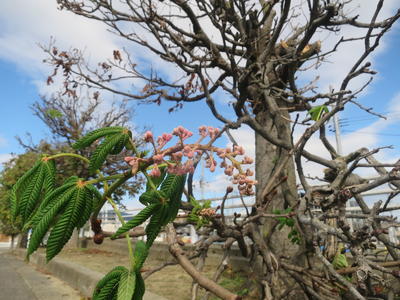 その一部の枝の先にふと目をやると、緑の葉と薄紅色の花が確認できました。(下写真)