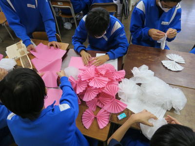 また、教室では、会場係の生徒たちが、飾り付けをするためのたくさんの花を、色紙を使って楽しそうに折っていました。