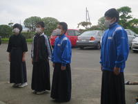 文化部の横断幕に見送られて、まず、剣道部と卓球部男子、ソフトテニス部が学校を出発しました。
