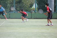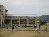 朝早くから、中庭のコートでは、ソフトテニス部の部員が軽い調整をしています。