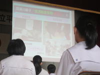 3年生が対象で、説明会では、手元の学校案内のパンフレットやスクリーンに映し出される学校の特色に目を向けながら、講師の高校の先生のお話に集中しています。(下写真)