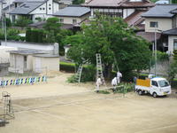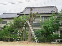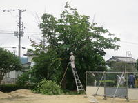 ところで、この工事に合わせた形で、中庭のテニスコートの近くに立つトチノキの剪定作業が行われました。