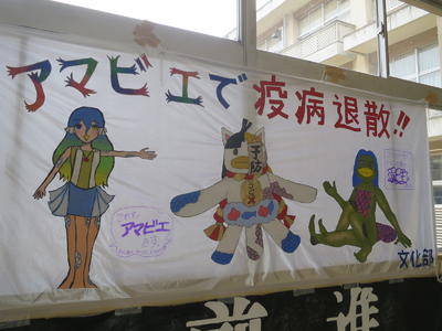 はじめは、中央のアマビエのみのポスターにする予定でいたそうですが、アイディアがいろいろと出てきて、最終的にこの横断幕ができあがったということです。
