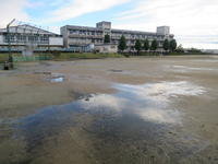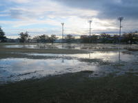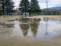 この広範囲の水たまりが、校庭の凹凸の状況をよく示しています。