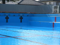 先週、注水を始めた学校プールも満水となり、本日、業者がろ過機を点検し、稼働し始めました。(写真A)