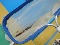 水を入れ始めてからは、これまで毎日、本校担当教員が、水面を漂う浮遊物や、底に沈んでいるスギの葉等をゴミとり網ですくいとっていました。(写真C)