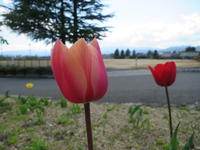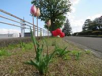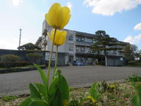 校門前には、チューリップが、太陽の光をいっぱいに受けて花を咲かせています。