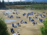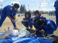 校庭のあちらこちらに水たまりが残る中、班ごとに足場のいい場所を選びながら野外炊飯を開始しました。