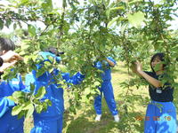 きのう、1年生が果樹栽培体験活動でリンゴの摘果作業を行いました。