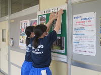 昼休みには、廊下の掲示物を張り替える生徒会広報委員会の生徒の姿がありました。