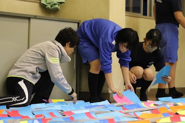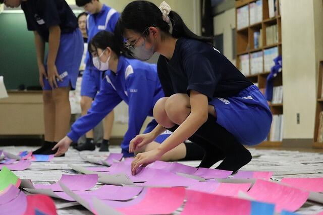 青春の舞台。〔ビッグアート準備〕 2024年10月7日 17時30分 今日の出来事 全校生が描いたピースを、一生懸命組み合わせるビッグアート係の生徒たち。どんな素敵な一枚の絵になるのか…楽しみです。真剣そのもの。