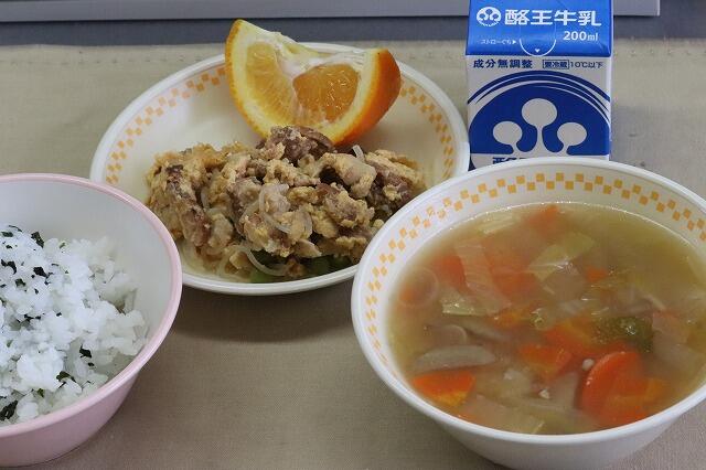 2025年1月30日 14時15分本日の給食献立は、「油麩の卵とじ・だまこじる・いよかん・わかめごはん・牛乳」でした。