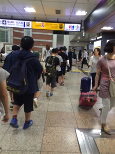 新幹線では始終楽しい会話が続いたとのこと。東京見学前に、しっかりトイレをしなきゃとばかり、長い列を作ったそうです。東京駅丸の内出口から地下鉄丸ノ内線に乗り換えです。