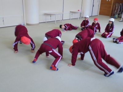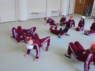 2016年3月11日 11時29分 グループごとに、コーンがはじけてポップコーンになる様子を体で表現しました。