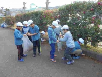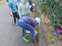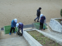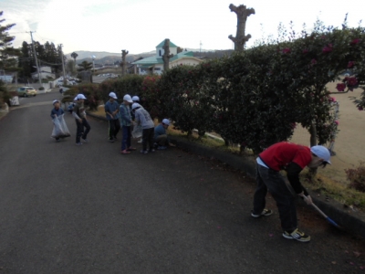4年生です。朝から玄関前の落ち葉を拾っています。