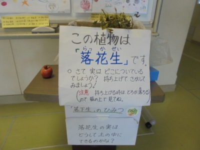 理科の先生が、こんなコーナーを作りました。落花生(らっかせい)に実がついたそうです。しかも意外な場所に・・・。