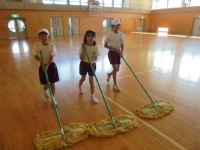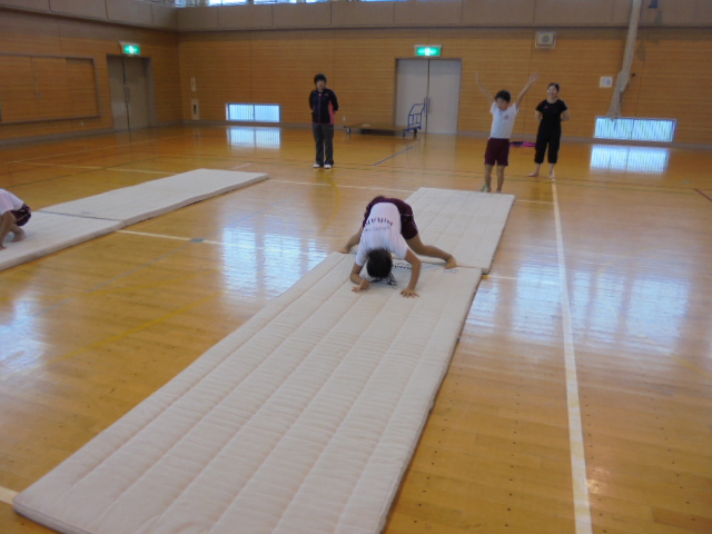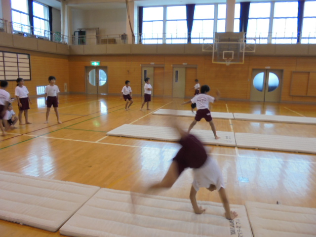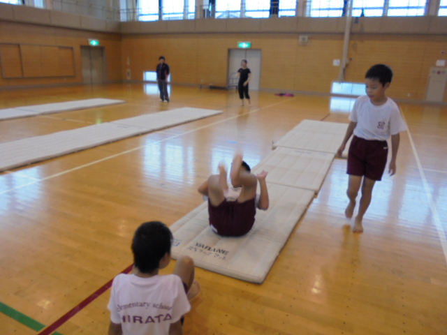 技は,後転、開脚後転、側転など。ゲストティーチャーの先生のアドバイスをいただきながら、どの子も一生懸命に練習していました。あまりに真剣な様子に声をかけるのもはばかられるほど。