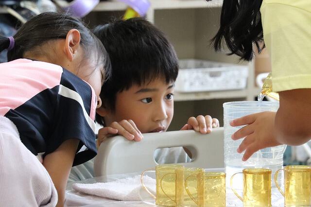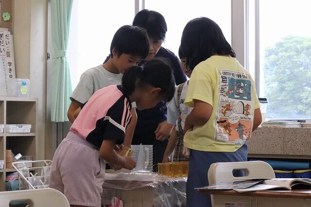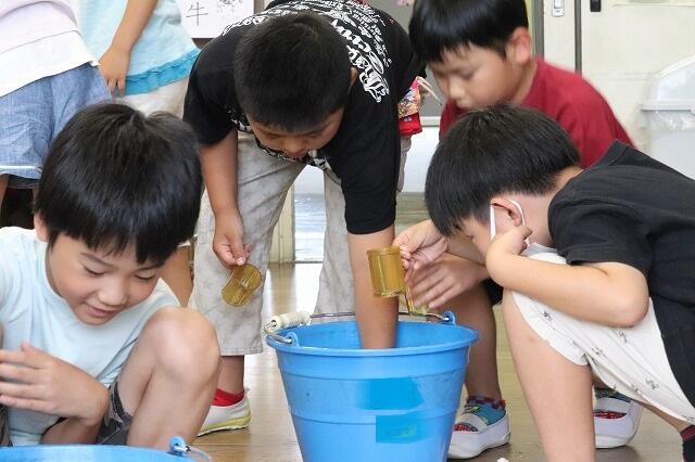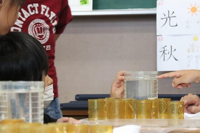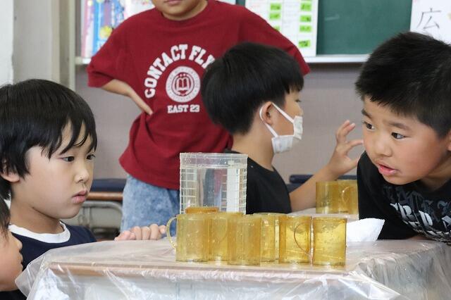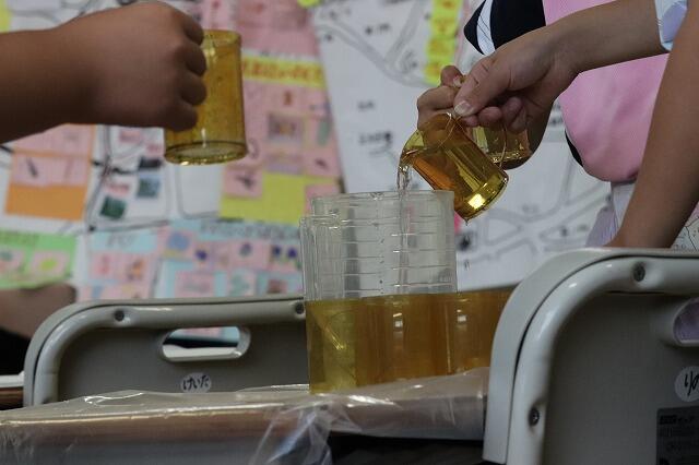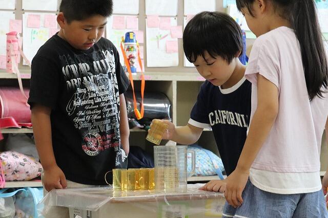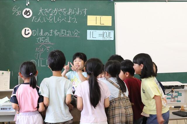 2023年6月30日 18時00分2年生が、目的に応じた単位で量の大きさを的確に表現したり比べたりすることができるように、かさの単位「デシリットル(dL)」「リットル(L)」「ミリリットル(mL)」の学習をしていました。