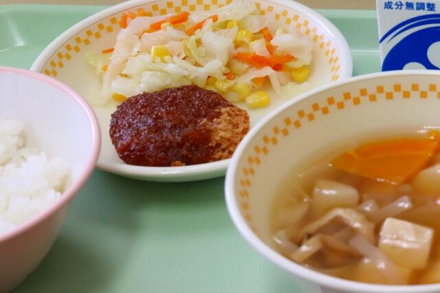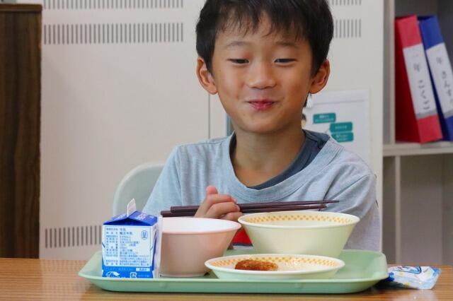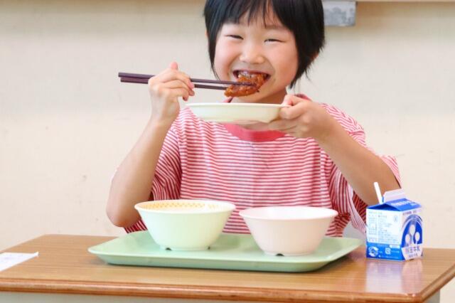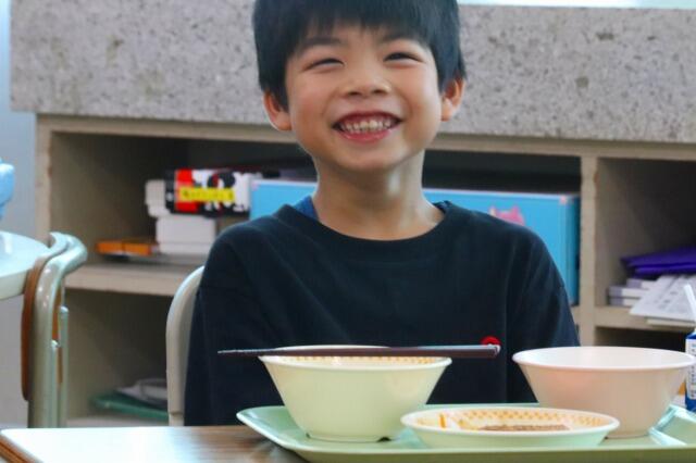 2023年9月14日 12時10分本日の給食献立は「県産ソースメンチカツ・嬬恋高原キャベツのサラダ・こしね汁・ごはん・牛乳」でした。柔らかなメンチカツはもちろん、「こんにゃく」「しいたけ」「下仁田ねぎ」が入った「こしね汁」を、1年生もモリモリいただいていました。かわいらしい “美味しい顔” です。