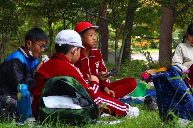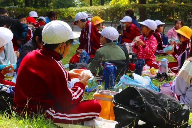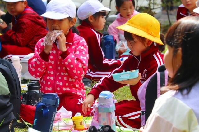 2023年10月13日 18時50分雲一つない青空の下、皆で気持ちよくお弁当をいただきました。おにぎり5つをペロリとたいらげる4年生も! 保護者の皆様、お弁当の準備ありがとうございました。皆、美味しそうにいただいていました。