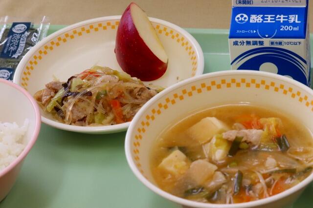 2023年10月16日 18時10分本日の給食は、世界の料理〔韓国〕を味わおう献立で「チャプチェ・キムチチゲスープ・味付けのり・りんご・ごはん・牛乳」でした。ごま油香るチャプチェもピリ辛のスープも本格的な韓国料理でした。また、旬のくだもの「りんご」がとても瑞々しく美味しゅうございました。