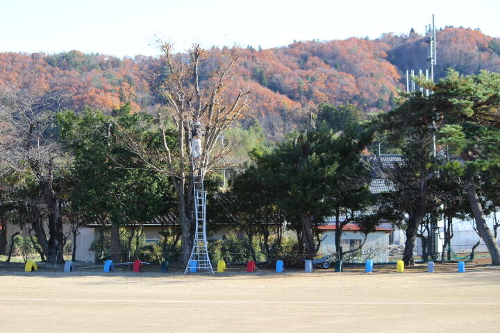 ケヤキの木のてっぺん近くに、技能主査の姿がありました。