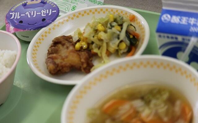 10月10日は目の愛護デーにちなんだ献立「鶏のから揚げ・白菜スープ・ビタミンAたっぷりサラダ・ブルーベリーゼリー」でした。目の疲れを食事で和らげる…ぜひ、本日配付された「食育だより」をご覧ください。目を大切に!