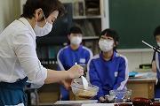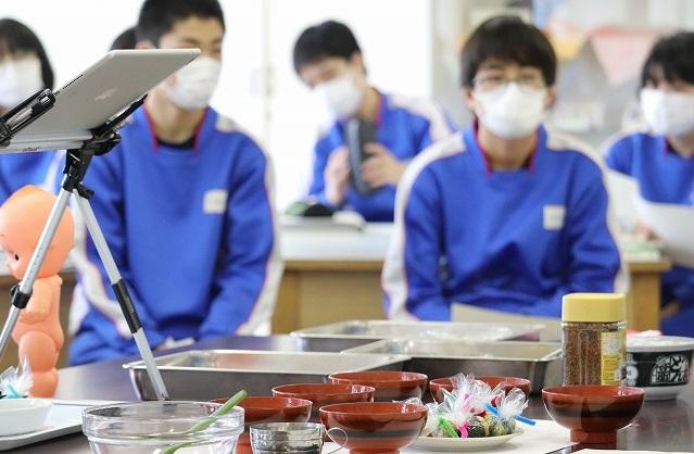家庭科のオリエンテーションは、家庭科担当と栄養教諭による「悪魔のおにぎりと簡単味噌玉作り」のデモンストレーション。新型コロナウイルスに負けないためにも、しっかり食べて “免疫力” を高めましょう。食べることは生きることです。