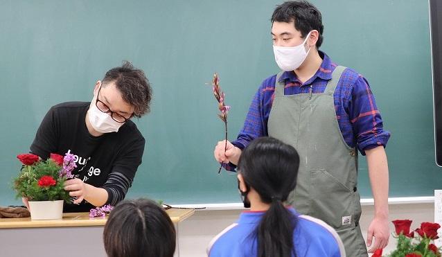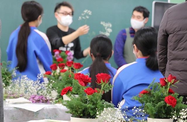 2020年11月20日 20時00分令和2年11月20日(金)、ふれあい学習室の生徒を対象に福島県花き振興協議会様主催の「フラワーアレンジメント教室」を開催しました。生花店の方々にご指導いただきながら、クリスマスを意識した赤いバラ・カーネーションと雪のイメージのカスミソウを思い思いに生け、きれいなアレンジメントを完成させることができました。