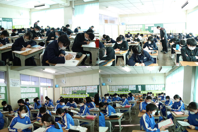 3組は数学の授業で、平行と合同の単元テストを行っていました。証明も少しずつかけるようになっています。