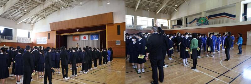 3年生が集団行動の訓練を行っていました。来週から行われる修学旅行での集合体系をいろいろなパターンで行っていました。さすが3年生です。200名ではありますが、早く正確に整列を行っていました。