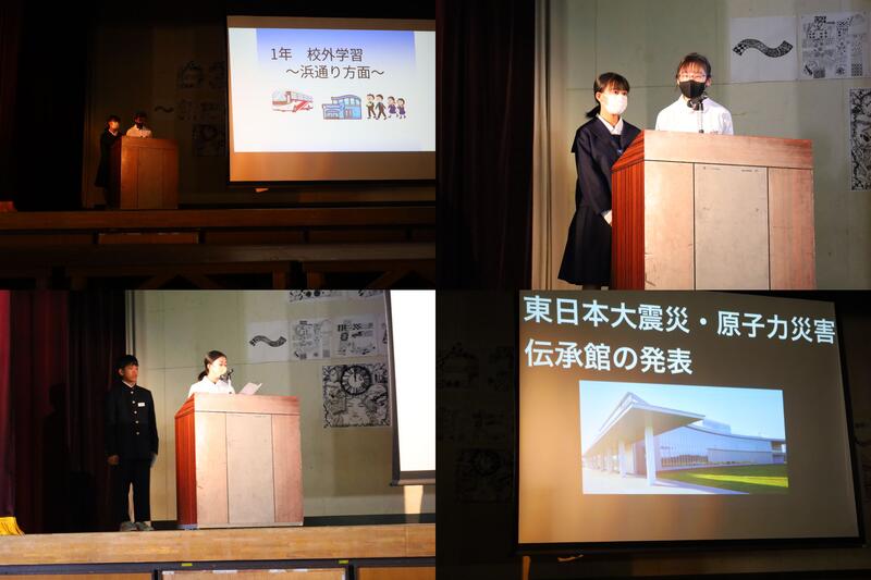 「福島の過去を知り、未来を見つめなおそう」というスローガンのもと校外学習で訪れた、伝承館や請戸小学校、アクアマリンふくしまの発表をクイズを交えて発表しました。