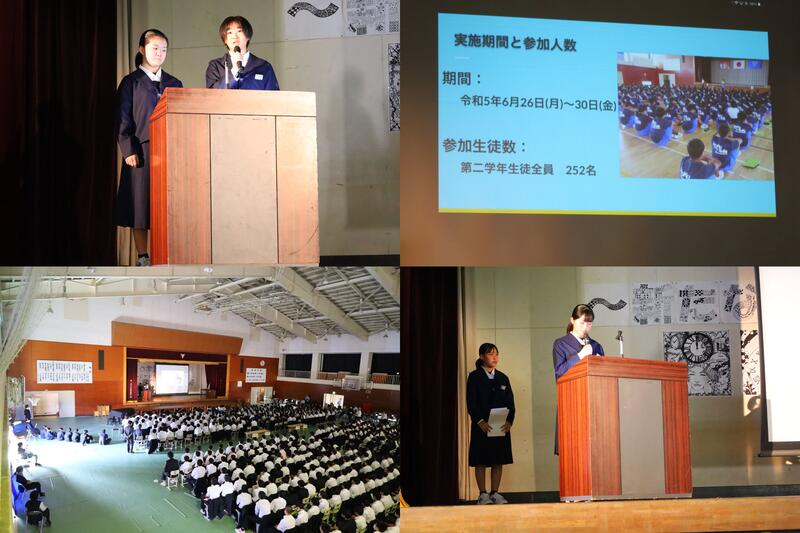 3年生は、昨年度「地域探究活動」として取り組んだ北信地区の課題について取り組んだことから、今年度は「地域貢献活動」として北信地区の駅や公園、通学路のゴミ拾いや除草作業、美化活動に取り組んだ成果を発表しました。