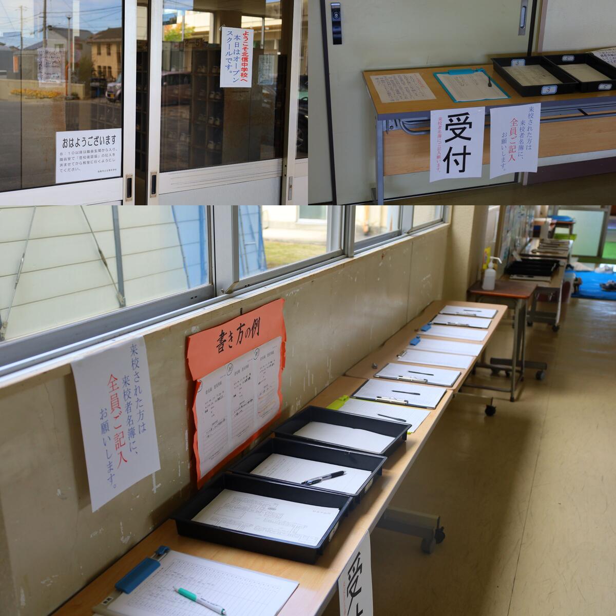 各学年の昇降口に受付を設けましたので、名前を記入の上、クラス名簿にチェックをお願いいたします。