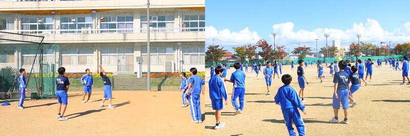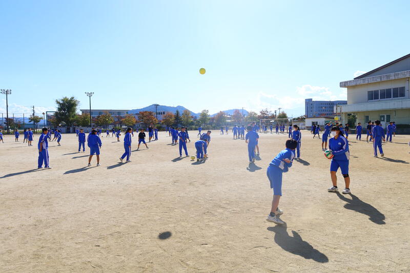 7,8組は体育の授業で校庭でバレーボールの練習をしていました。