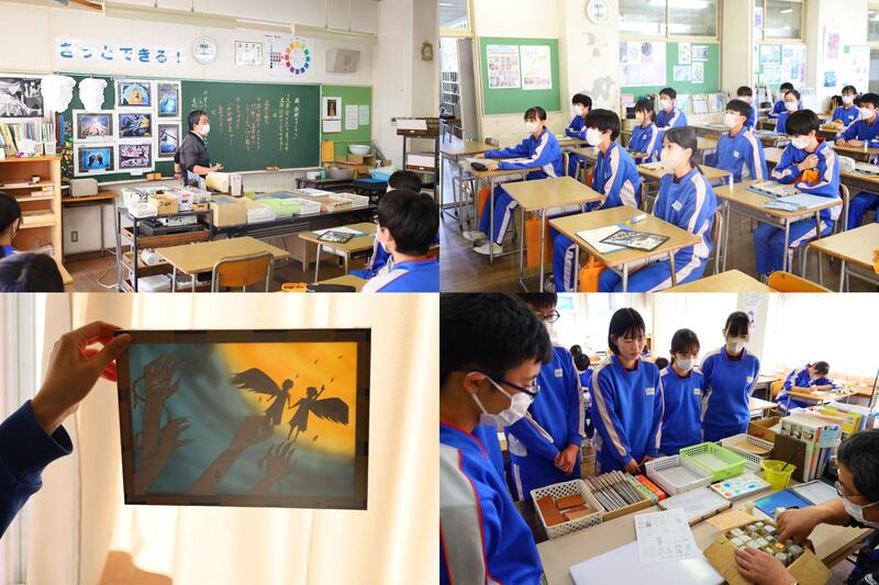 5組は美術の授業で影絵のまとめ作業を行っていました。早めに終わった人は、篆刻の話を聞いていました。